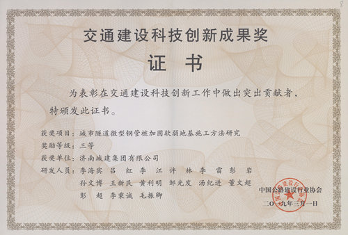 集团《城市隧道微型钢管桩加固软弱地基施工方法研究》荣获“交通建设科技创新成果奖三等奖”