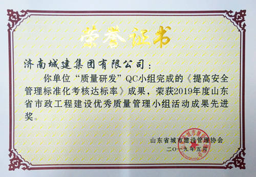 集团“质量研发”QC小组完成的《提高安全管理标准化考核达标率》成果荣获“2019年度山东省市政工程建设优秀质量管理小组活动成果先进奖